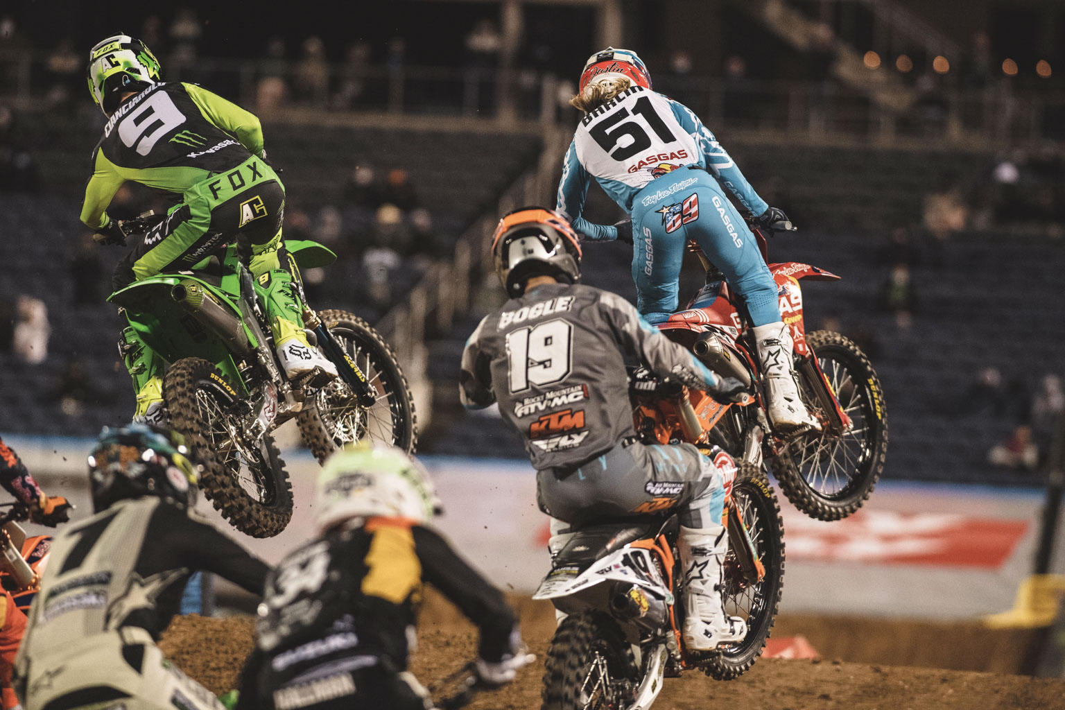 Justin Barcia lined himself up for a great start in the Main Event as he nailed another holeshot aboard his MC 450F, settling into second on the first lap. He got passed early on and went to fourth, leading a hard-charging pack of riders all fighting for a chance at the podium.