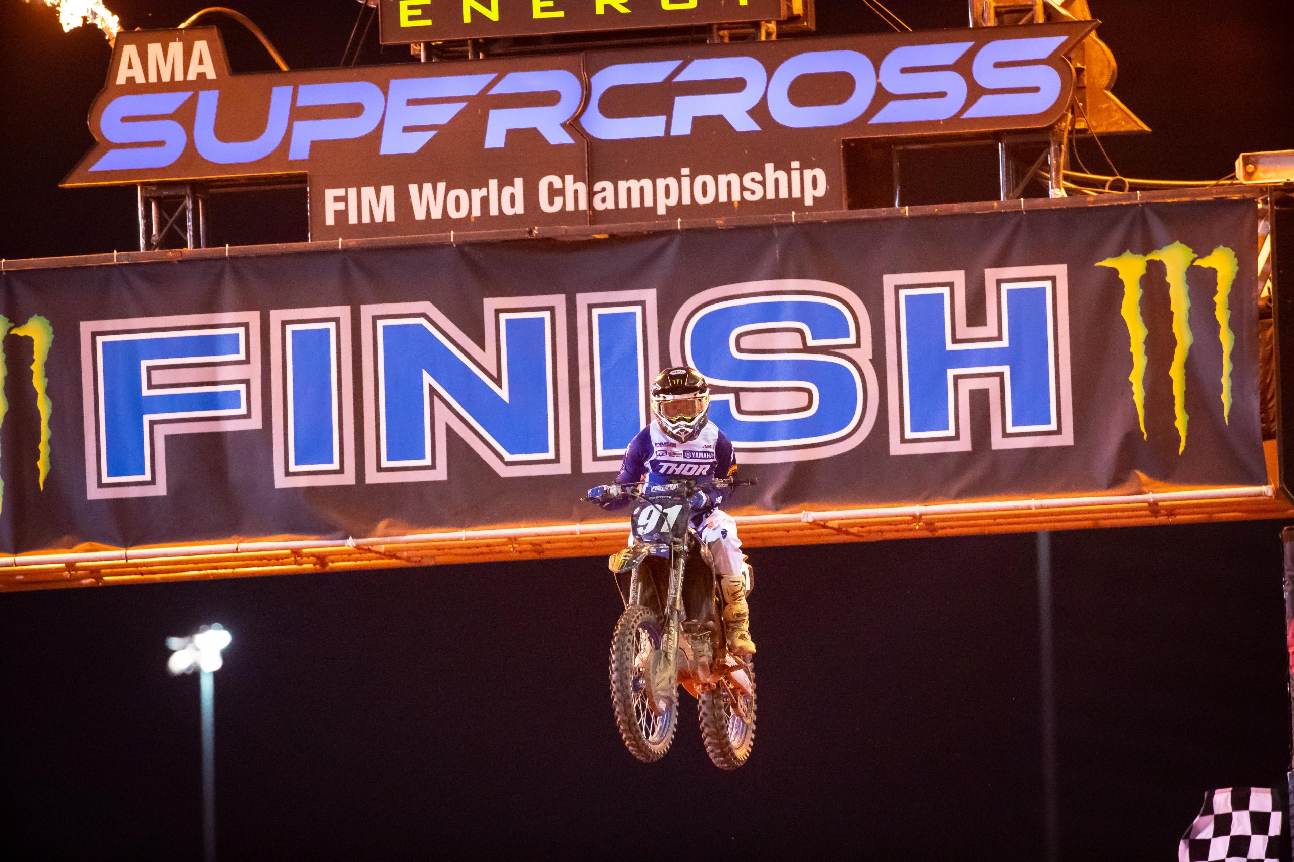 The Western Regional 250SX Class delivered unbelievable drama and action but the winner of the night was Rookie Nate Thrasher. It was his second-ever career win after his first victory one week prior at the same venue. Making the first place finish even more dramatic, for the second time Thrasher had to qualify for the Main Event through the Last Chance Qualifier. In both cases the Yamaha rider won the LCQ then went on to win the Main Event in convincing fashion.