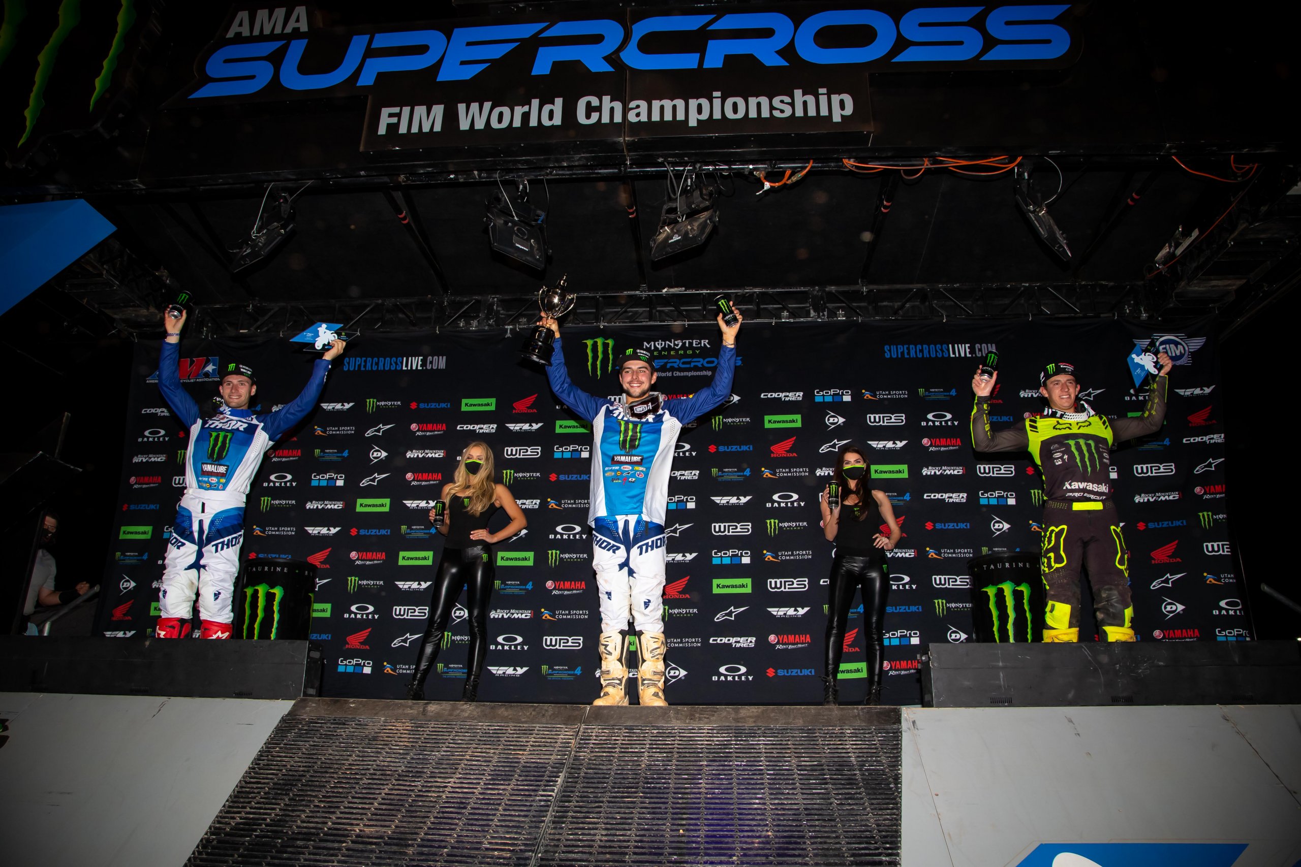 250SX Class podium (riders left to right) Justin Cooper, Nate Thrasher, and Seth Hammaker. Photo Credit: Feld Entertainment, Inc.