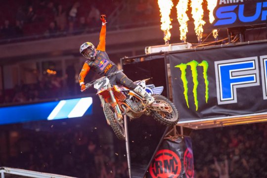 Red Bull KTM’s Cooper Webb grabbed a thrilling 450SX Class win in round 15 of the Monster Energy AMA Supercross at Atlanta Motor Speedway . Previous-round winner Team Honda HRC’s Ken Roczen led most of the race but crashed out of a big lead and took second. And defending champion Monster Energy Kawasaki’s Eli Tomac fought forward and finally reached as high as third for a podium finish.