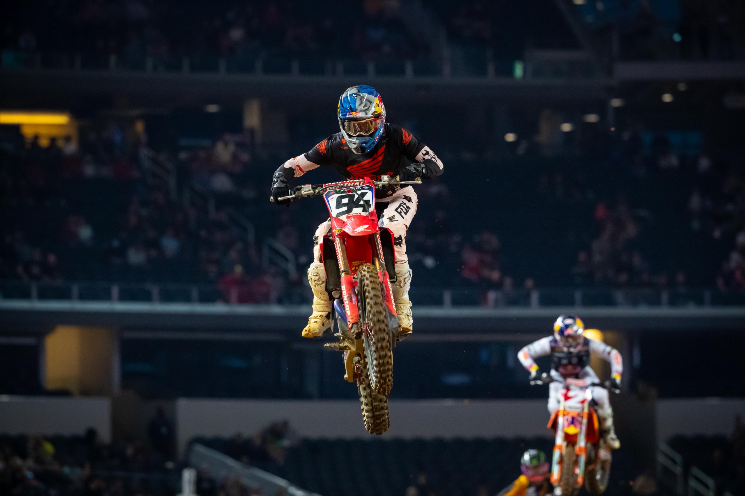 Webb said :“I was just focusing on being consistent. I rode terrible in that heat race and didn’t like being put on the ground – that fired me up and got me going for the Main Event. To ride with Kenny that whole race and make a late charge was awesome, I felt really good out there. It’s incredible to get three here in Dallas, it’s unheard of for me. I’m pumped!”