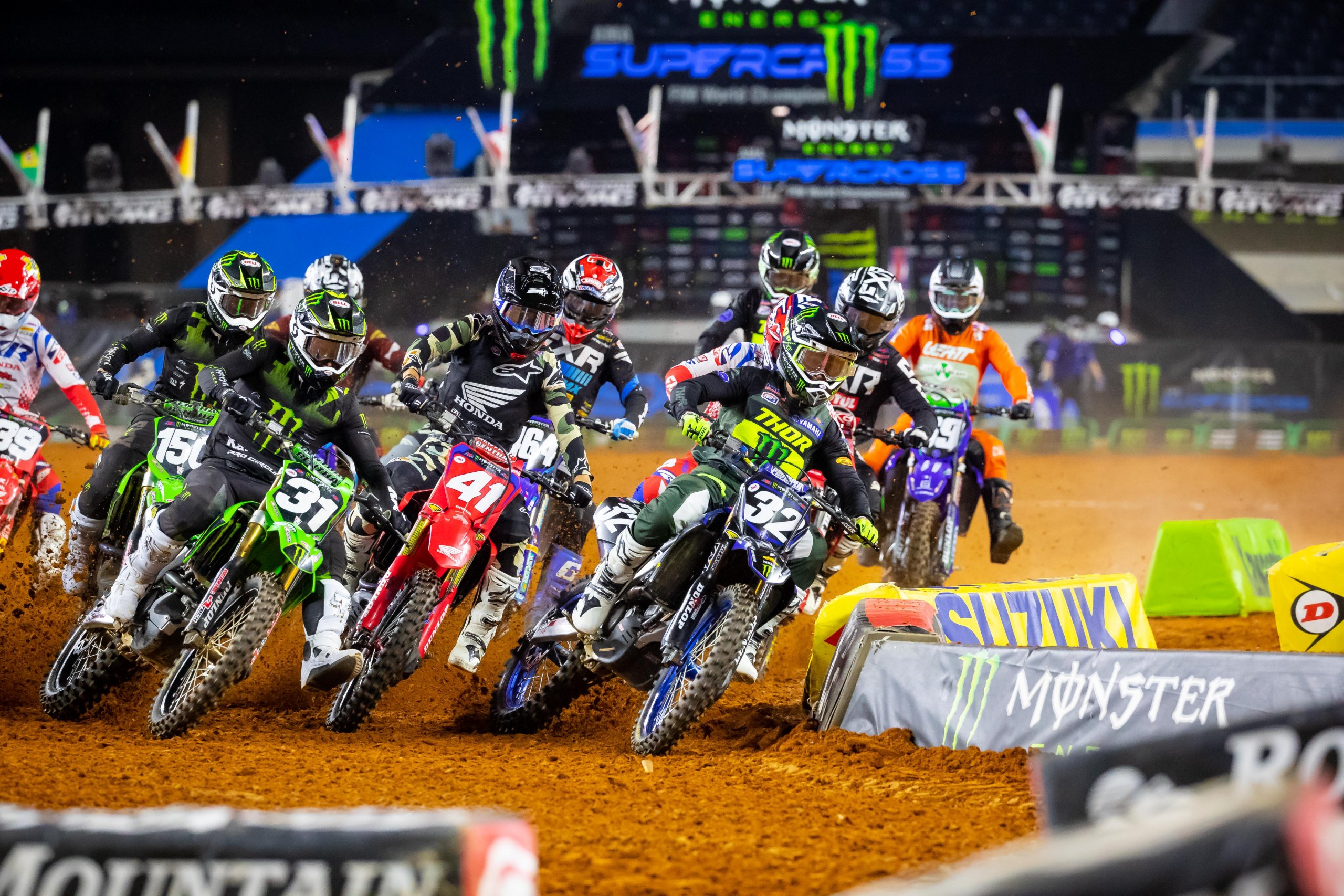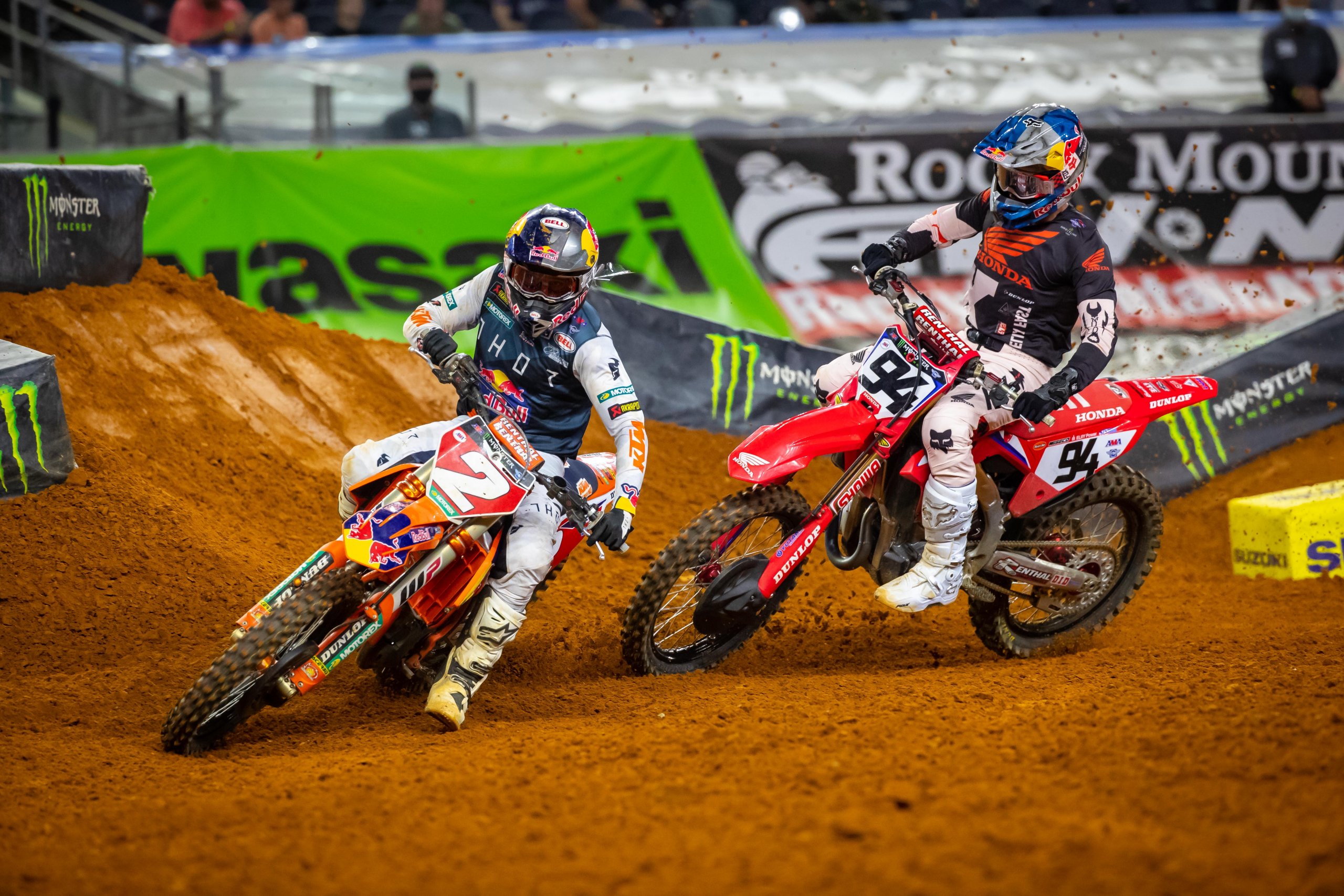 The final Texas race and Round 12 of the 2021 Monster Energy AMA Supercross, an FIM World Championship was once again Red Bull KTM’s Cooper Webb’s night. The 450SX Class racer took a well-earned and dramatic win in front of the enthusiastic limited capacity, pod-seated crowd inside AT&T Stadium. Team Honda HRC’s Ken Roczen led most of the event and held on for a close second place finish, and Monster Energy Kawasaki’s Eli Tomac was a threat until the end but finished the night in third.