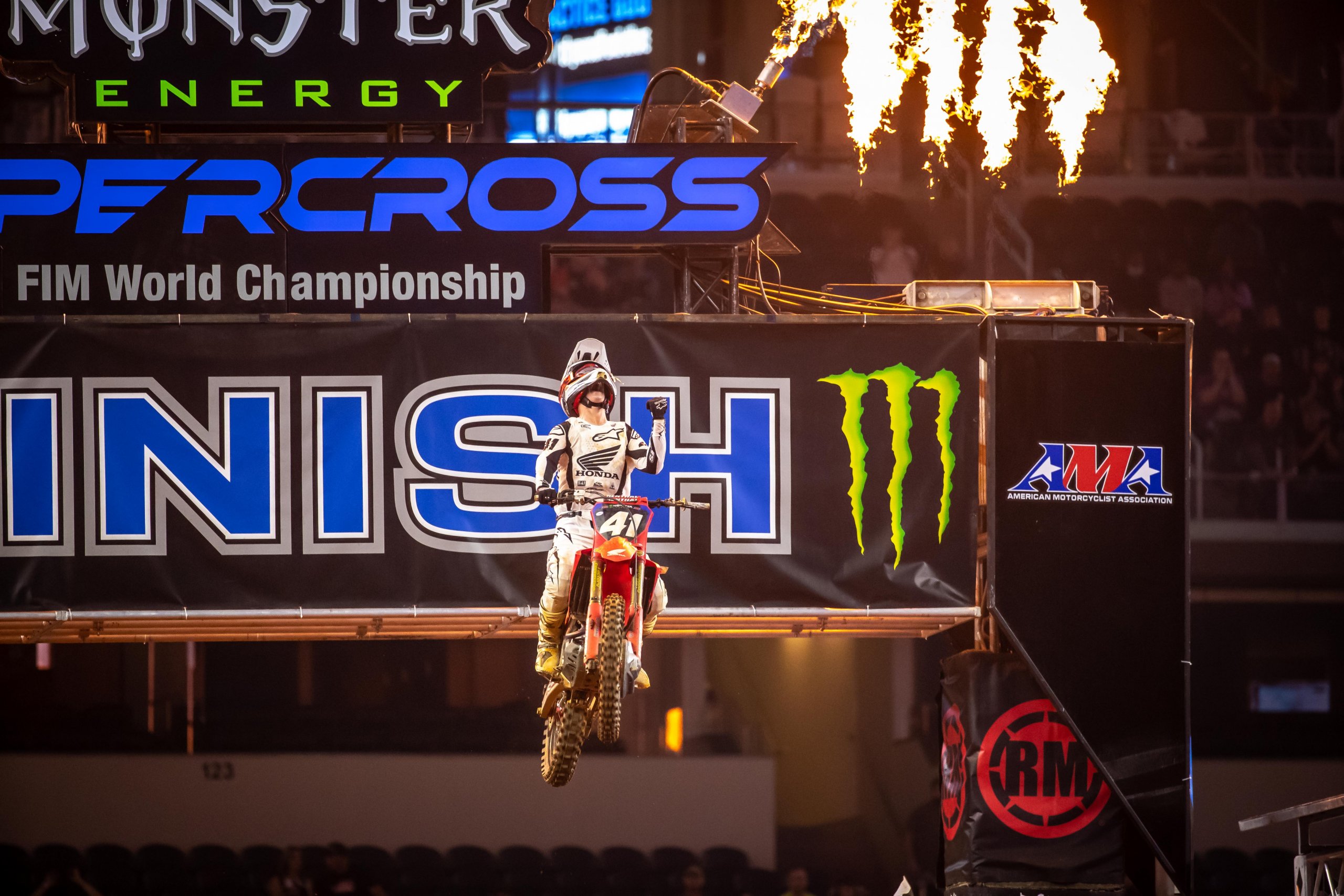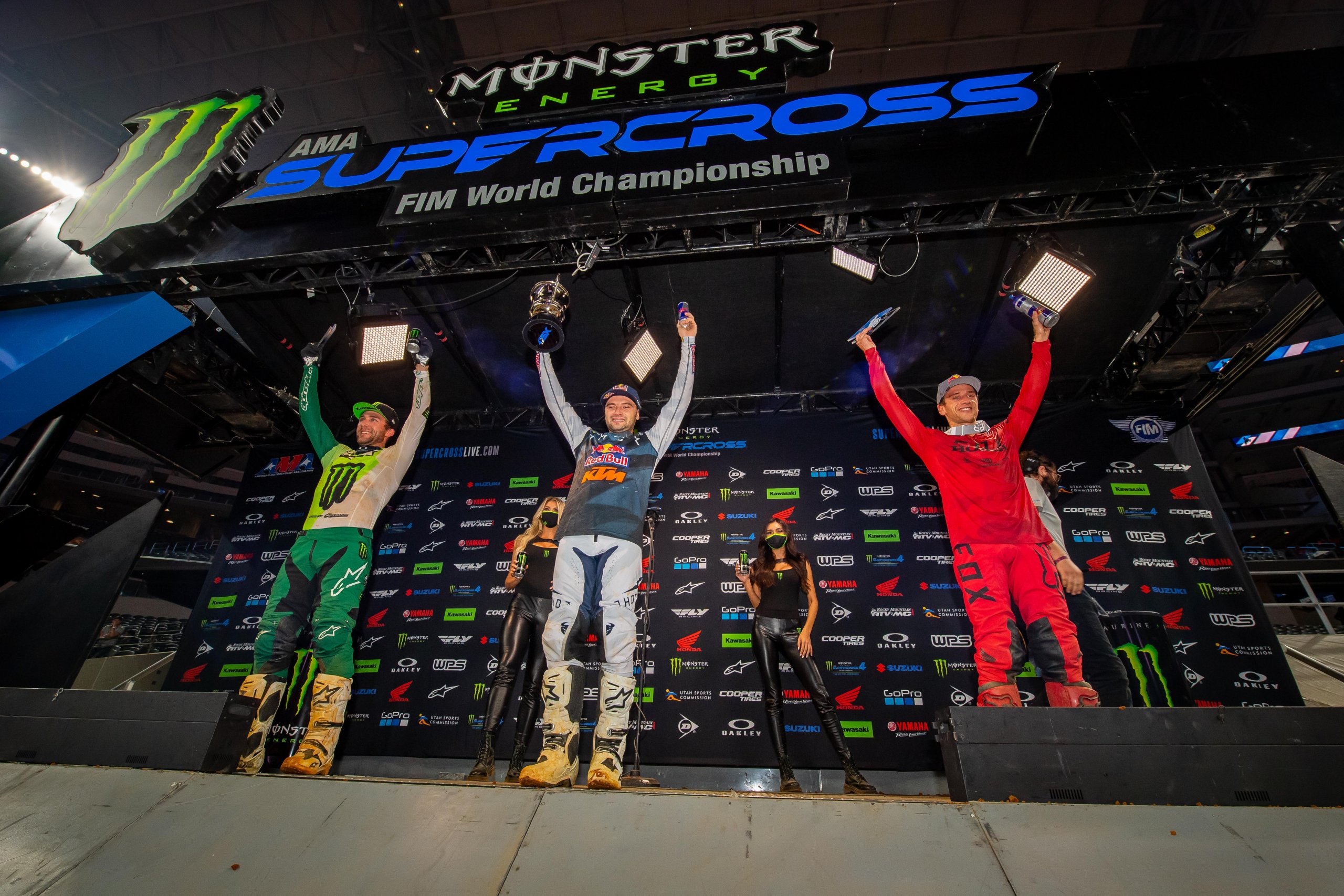 Red Bull KTM’s Cooper Webb took the win again in front of a limited capacity, pod-seated crowd of excited race fans in the second Arlington Supercross on Tuesday night, extending his series lead. Monster Energy Kawasaki’s Eli Tomac earned second place points and Team Honda HRC’s Ken Roczen rounded out the podium in third. And there was controversy as Jason Anderson was docked a place after cutting the track, while the same track-cutting meant penalties in the 450LCQ and 250 main.